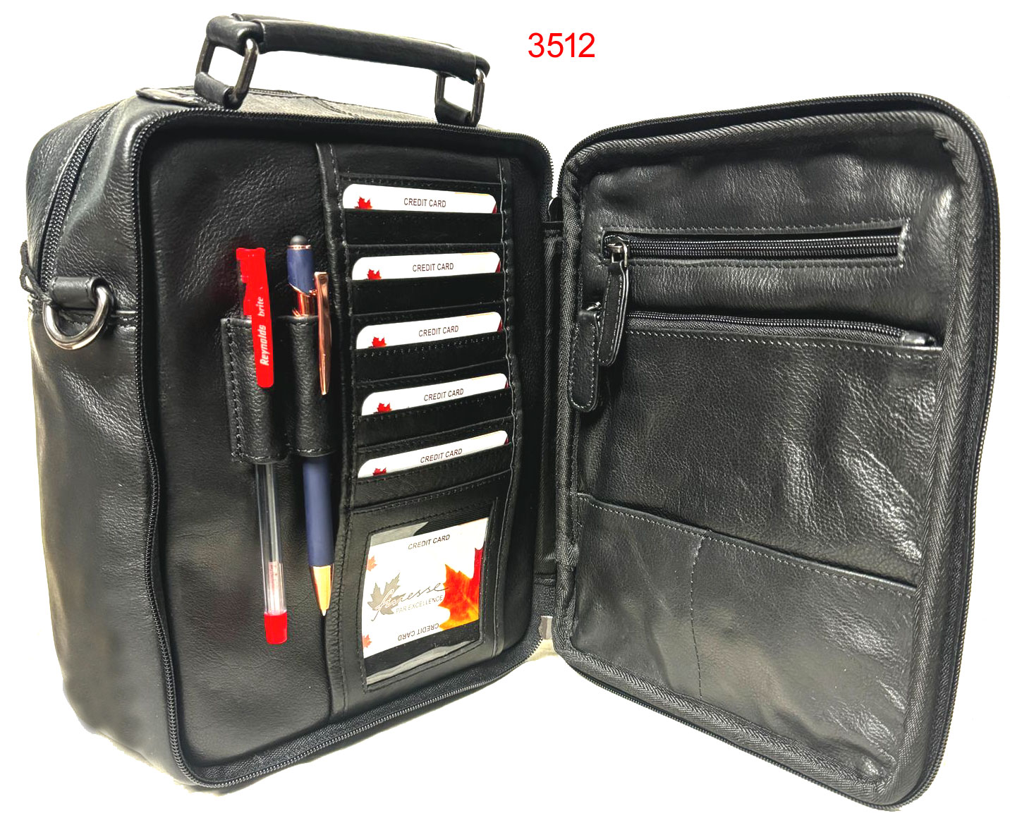 • 1 Double Zipper pocket at back with 2 Pen slot, 1 ID, 11 Cards, 2 open slots, 2 zipper pockets Inside